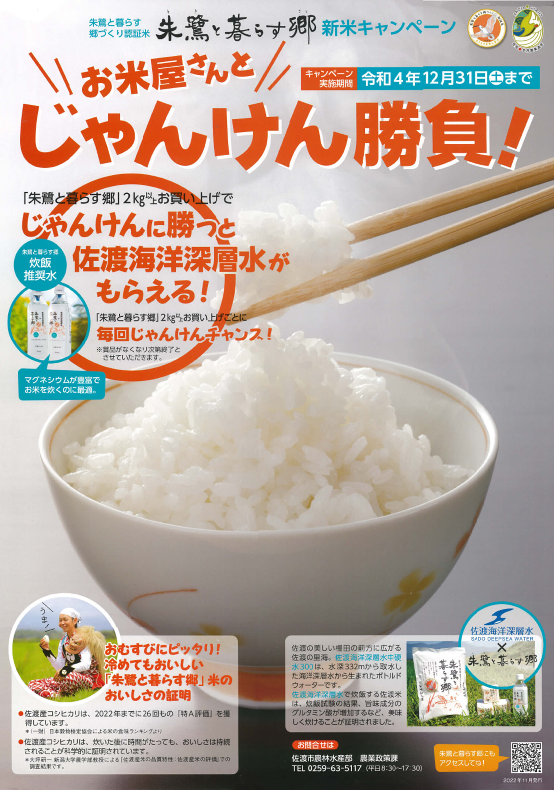 お知らせ TOPICS 一覧へ戻る 朱鷺と暮らす郷 新米キャンペーン 202212/19 今年もやります! 朱鷺と暮らす郷 佐渡コシヒカリお買い上げの方とじゃんけん勝負✊✌️✋ 勝って佐渡の海洋深層水もらってくださいね!