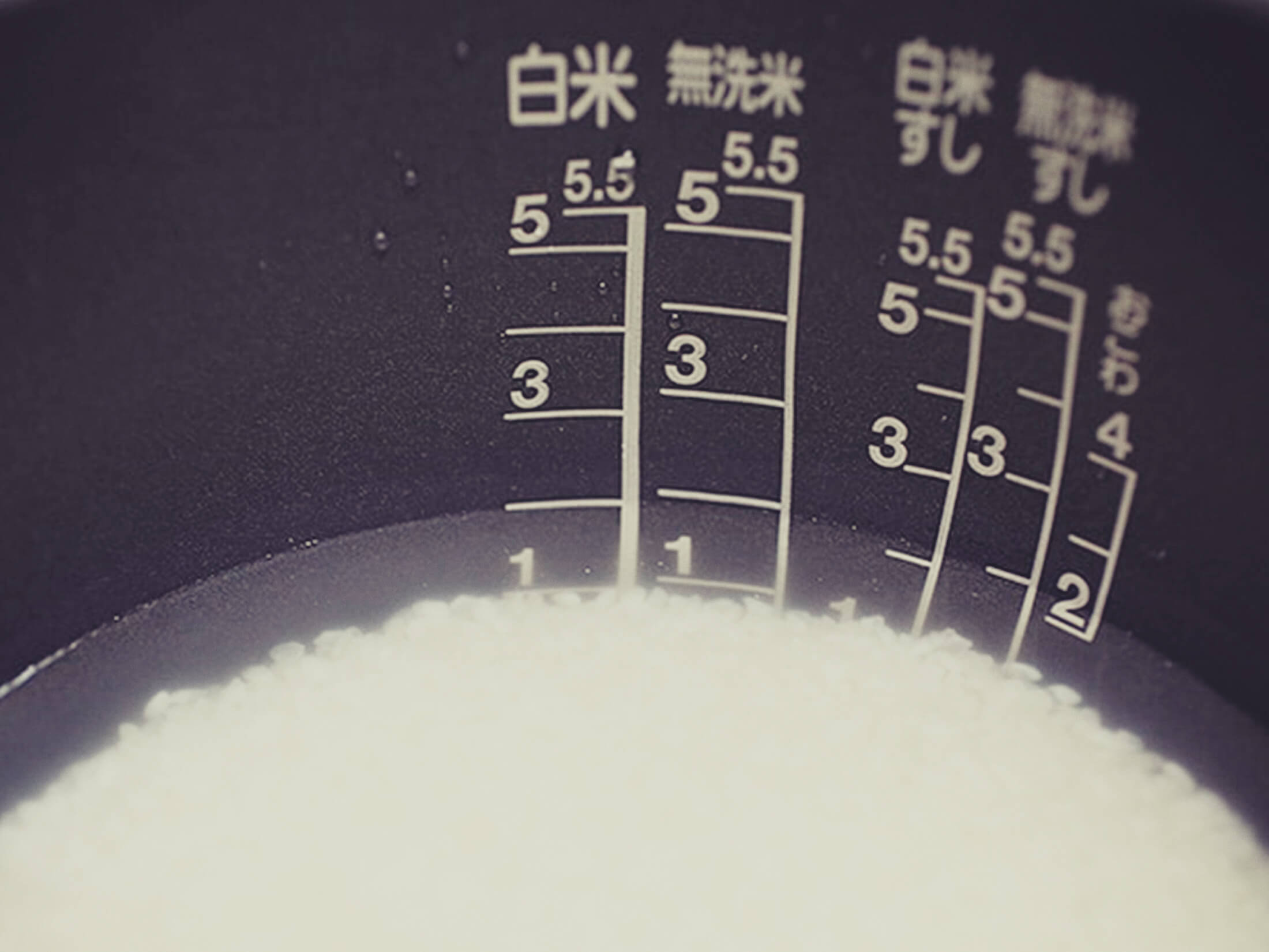 米1合に対して180ccの水が基本。浸水時間は、新米で40分〜1時間。古米は1時間くらい。夏は30分〜1時間、冬は1時間〜2時間、できるだけ冷たい水に浸けて米を冷やすと美味しいごはんになります。氷を入れてもOK。